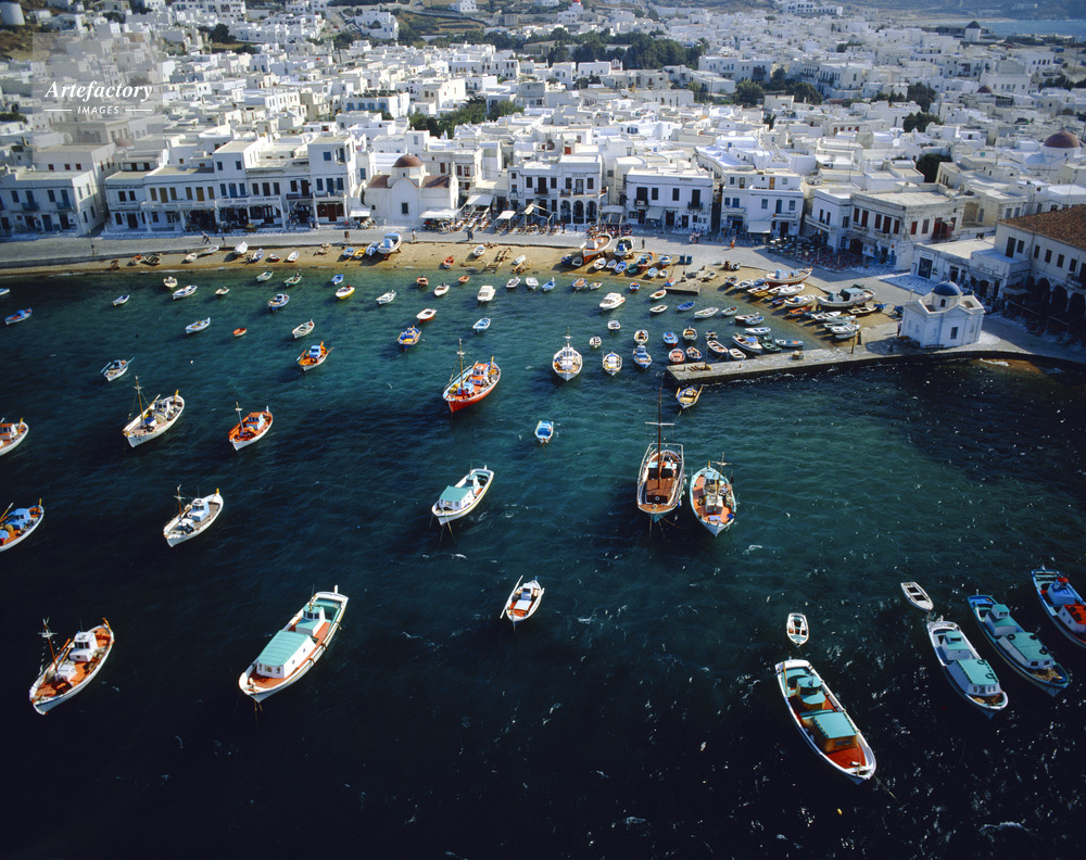 エーゲ海,Aegean Sea,キクラデス諸島,Cyclades,ミコノス島,Mykonos,ミコノス島の港,港,Port,漁船,Fishing boat,島,Island,海,Sea,海洋,Ocean,航空写真,Aero photo
