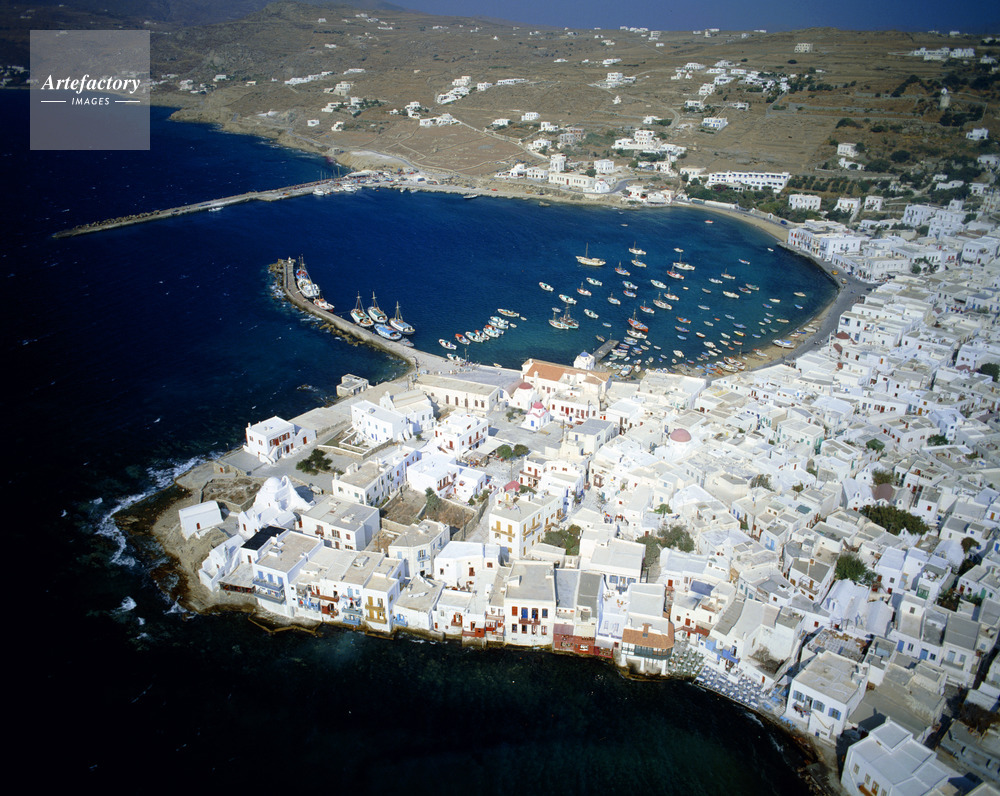 エーゲ海,Aegean Sea,キクラデス諸島,Cyclades,ミコノス島,Mykonos,ミコノス島の港,港,Port,漁船,Fishing boat,島,Island,海,Sea,海洋,Ocean,航空写真,Aero photo