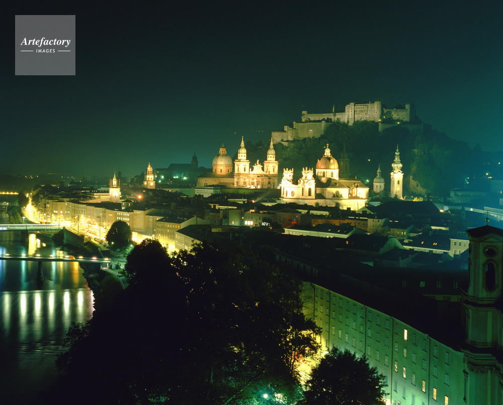 ザルツブルク州,Land Salzburg,ザルツブルグ,サルツブルク,Salzburg,ザルツ(塩の)ブルク(城),ザルツブルク市街の歴史地区,旧市街,ツェントラル,聖ペーター僧院教会,St.Petersstiftskirche,ザルツブルク大聖堂,ドーム,Dom,ホーエンザルツブルク城,Festung Hohensalzburg,ザルツァッハ川,Salzach,夜景,Night view,夜