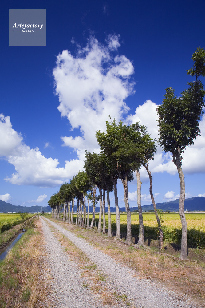 | 作品タイトル | 実りの新潟産コシヒカリと稲架木並木と小道 | モデルリリース | なし | |