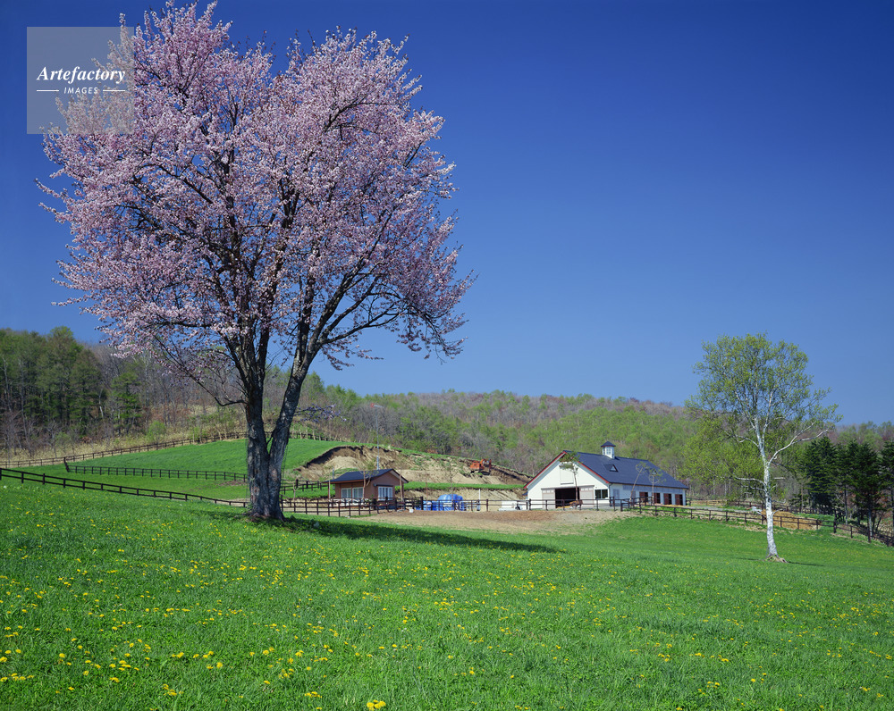 | 作品タイトル | タンポポ咲く牧場と一本桜。二十間道路と新冠町の町界 | モデルリリース | なし | |