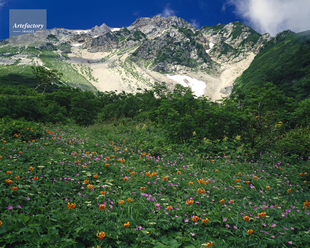 | 作品タイトル | クルマユリ・ハクサンフウロ咲く大出原から鑓ガ岳 国指定天然記念物 | モデルリリース | なし | |