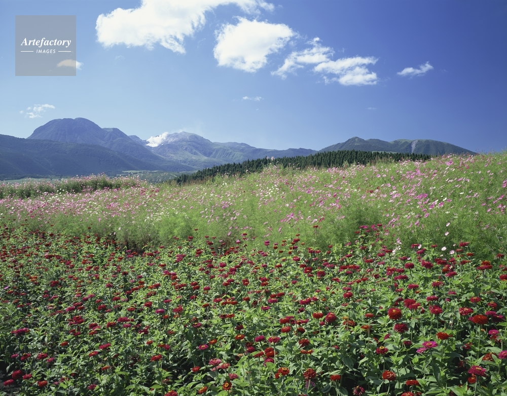 | 作品タイトル | 百日草とコスモス咲く飯田高原からくじゅう連山 | モデルリリース | なし | |