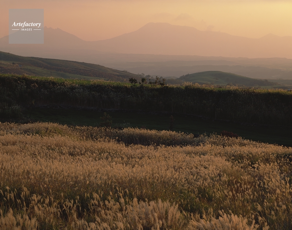 | 作品タイトル | 雄大な眺望の瀬ノ本高原ススキ原から阿蘇山を望む夕景 | モデルリリース | なし | |