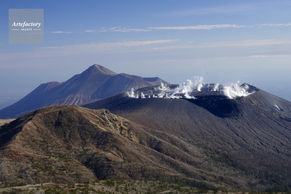 | 作品タイトル | 韓国岳(カラクニダケ)山頂から見える新燃岳の火口。後方は高千穂峰 | モデルリリース | なし | |