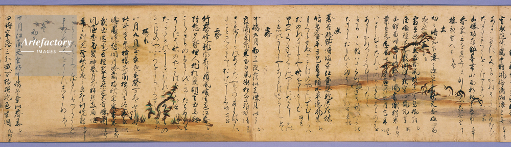 | キャプション | 紙本墨書,2巻, 芦手絵を描いた料紙に『和漢朗詠集』を書写したもので、下巻に「永暦元年四月四日、右筆黷之、司農少卿伊行」という奥書があり、永暦元年(1160)に藤原行成(972~1027)の五代の孫世尊寺伊行によって書写されたものであることがわかる。伊行は能書家として知られ、書道の秘伝書『夜鶴庭訓抄』を著したことでも知られる。 芦手絵とは、平安時代後期に流行した「芦手」と呼ばれた文字を取り込んだ絵のこと。芦・鳥・水流などさまざまな景物(四季の風物)のなかに、文字を絵画化して書き混ぜた「芦手」の意匠は、衣装や家具など多分野に (..) | 制限事項 | ||