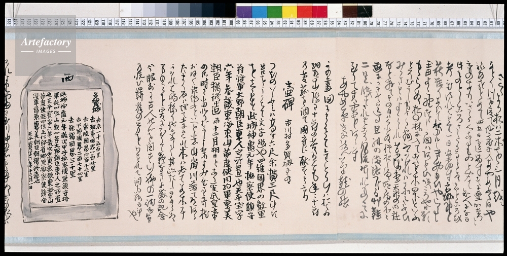 | キャプション | 紙本淡彩,2巻 本紙各縦29.2cm 全体縦31.0cm, 芭蕉の『奥の細道』の本文を書写し、それに蕪村が俳画を新たに描き加えたもの。全二巻からなる。 | 制限事項 | ||