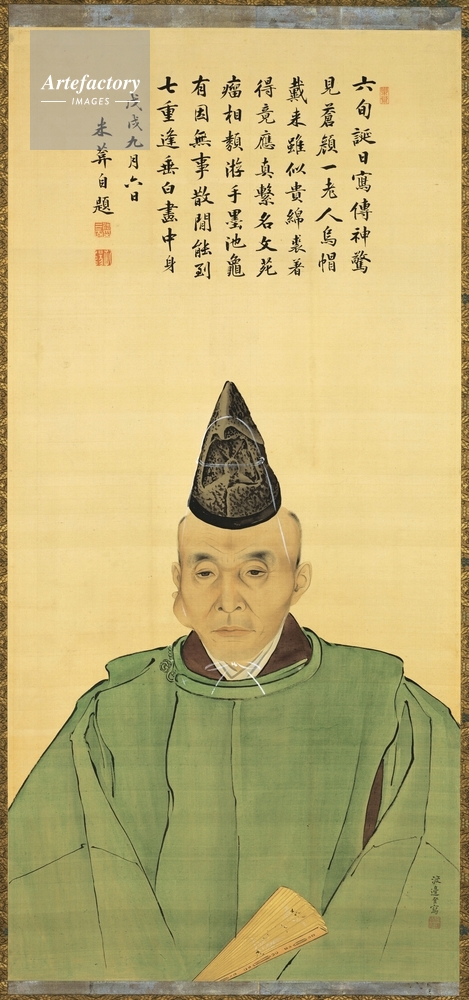 | キャプション | 絹本著色,1幅 縦 124.2 cm 横 59.1, 江戸時代後期の書家として著名な市河米庵の寿像。米庵の父は、儒家または漢詩人として声名を博した市河寛斎である。図上の米庵自身の賛文によれば、本図は天保9年の米庵の還暦のための像ということになるが、他の記録によって肖像自体はその前年に完成していたことが判明している。この時、渡辺崋山は45歳、円熟期の肖像画であり、附(つけたり)の同像画稿とともに崋山画の一極北を示す作品といえよう。また、画稿と正体ではやや相貌に違いがある。当時の画論類を見ると、肖像画は単にその人物に似ていることよりも、その人物の徳を表現することが (..) | 制限事項 | ||