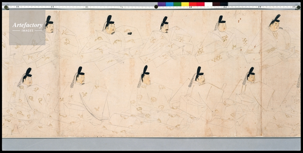 紙本淡彩,9紙 縦 36.2 cm 全長 521.6 cm, 摂関大臣などの公卿57人を上下2段に、上段は前を向いて、下段は背向して振り向く姿で描くもので、かつて「年中行事着坐図巻」と呼ばれたが、ある時の行事に集う人を描くものではなく、公家の列坐影である。宮内庁本天子摂関影によって像主を見ると、巻首の藤原忠通から、建長4年(1252)補任の摂関大臣まで描かれている。 筆者を藤原信実と伝えるように、画風は細線をひき重ねて像主の相貌を写し取る似絵の伝統的技法が生きており、隆信、信実以来の似絵の家系に筆者を求め得る。束帯の文様に有職を無視して蕪や大根まで描くのは異例 (..) |