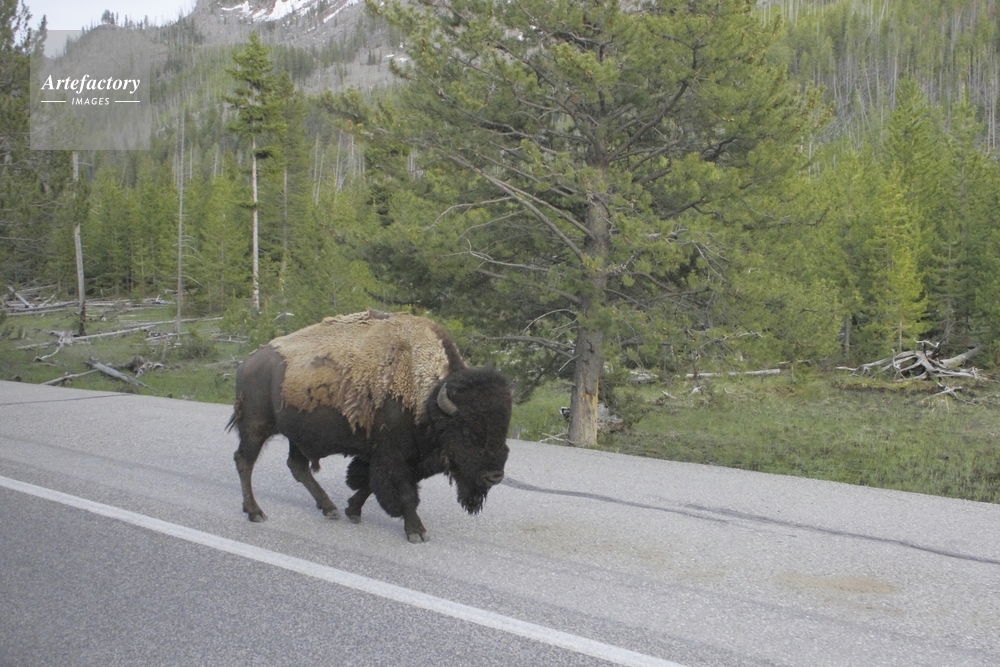 | キャプション | オールドフェイスフル地区 車道を歩くバイソン | 制限事項 | ||