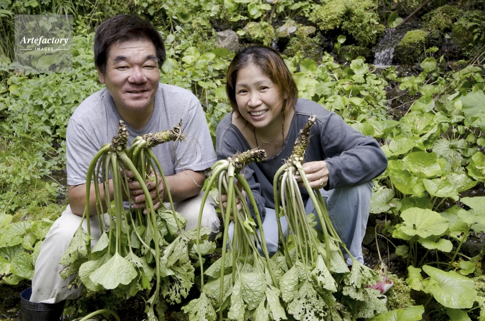 | 作品タイトル | 奥多摩のワサビ田で収穫したワサビを手にする農家夫婦 | モデルリリース | あり | |