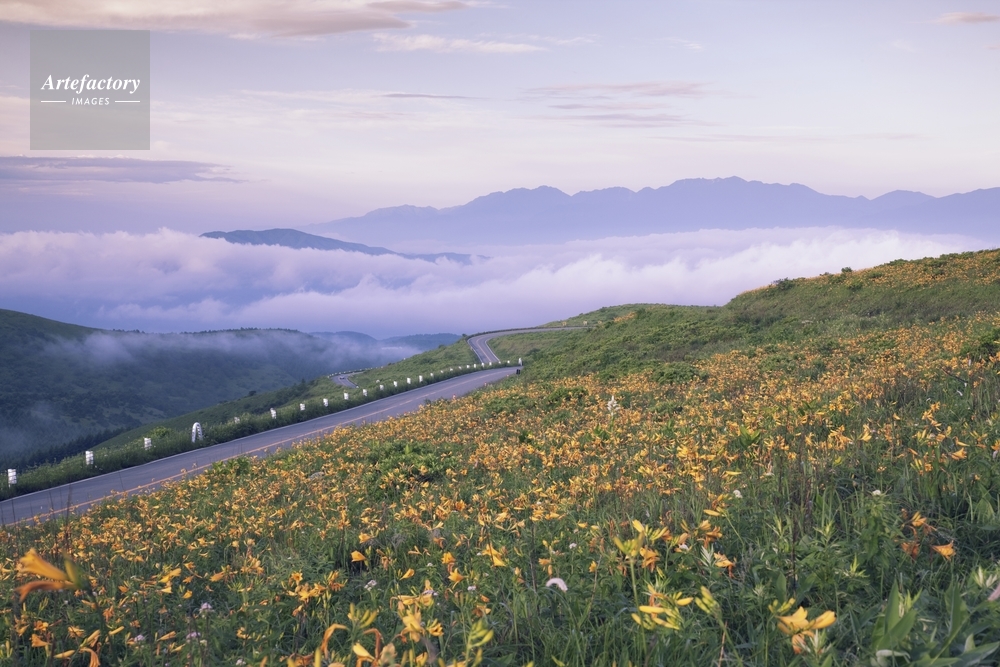 | 作品タイトル | ニッコウキスゲ咲く霧ヶ峰よりビーナスラインと中央アルプス朝景 | モデルリリース | なし | |