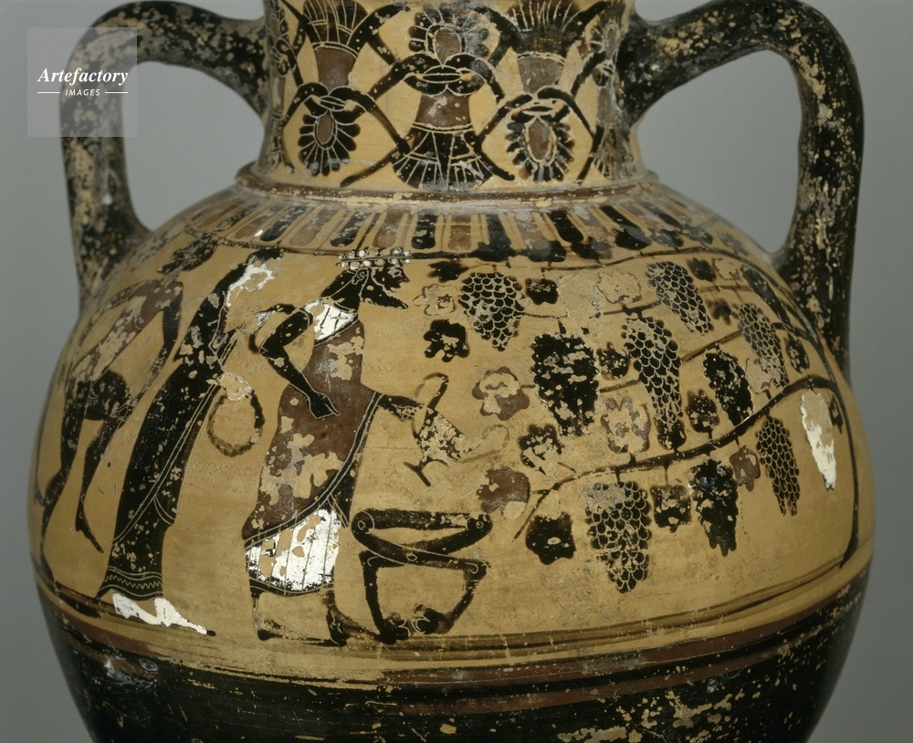 | 作品タイトル | Amphore tyrrheniennea figures noires: Dionysos au centre tenant canthare s'approche d'une vigne | モデルリリース | なし | |