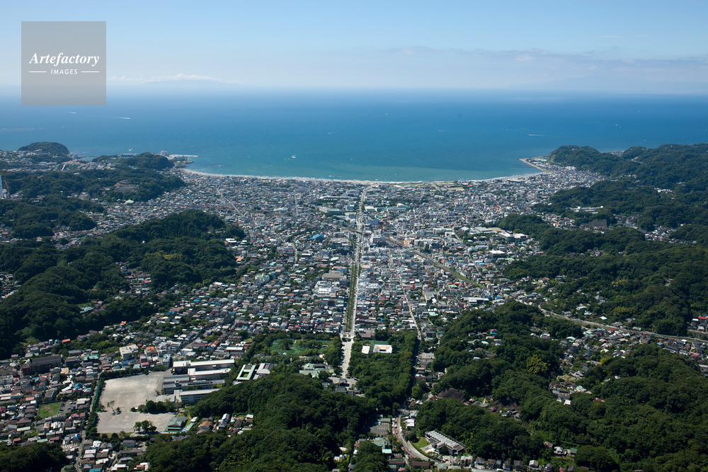 | 作品タイトル | 鶴岡八幡宮、若宮大路と鎌倉市街地より鎌倉海岸と相模湾 | モデルリリース | なし | |