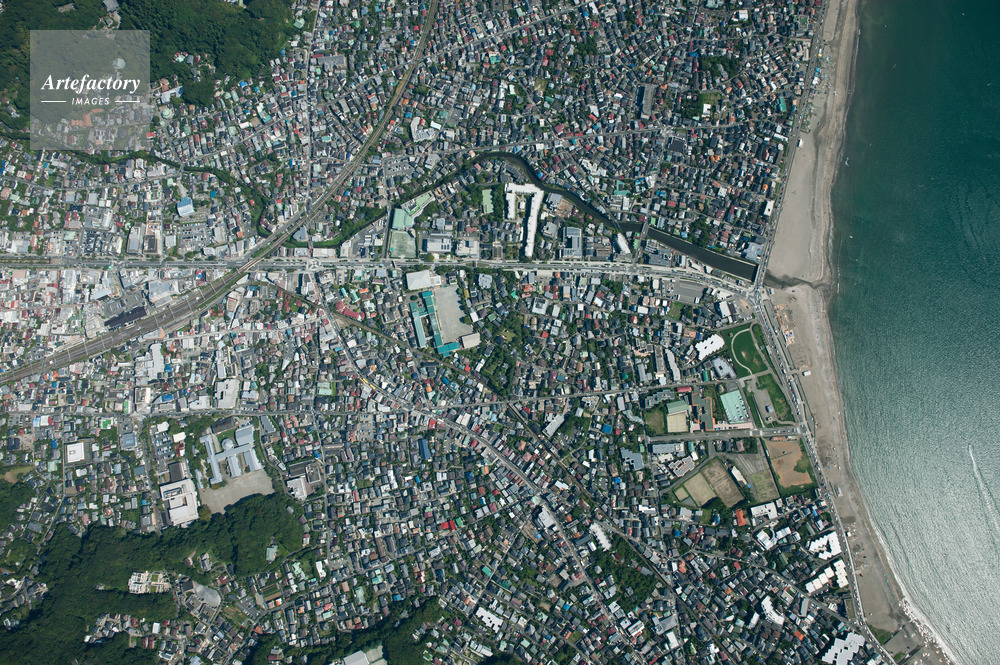 | 作品タイトル | 鎌倉駅と鎌倉市街地,由比ヶ浜、材木座海岸(俯瞰撮影高度1,500m) | モデルリリース | なし | |
