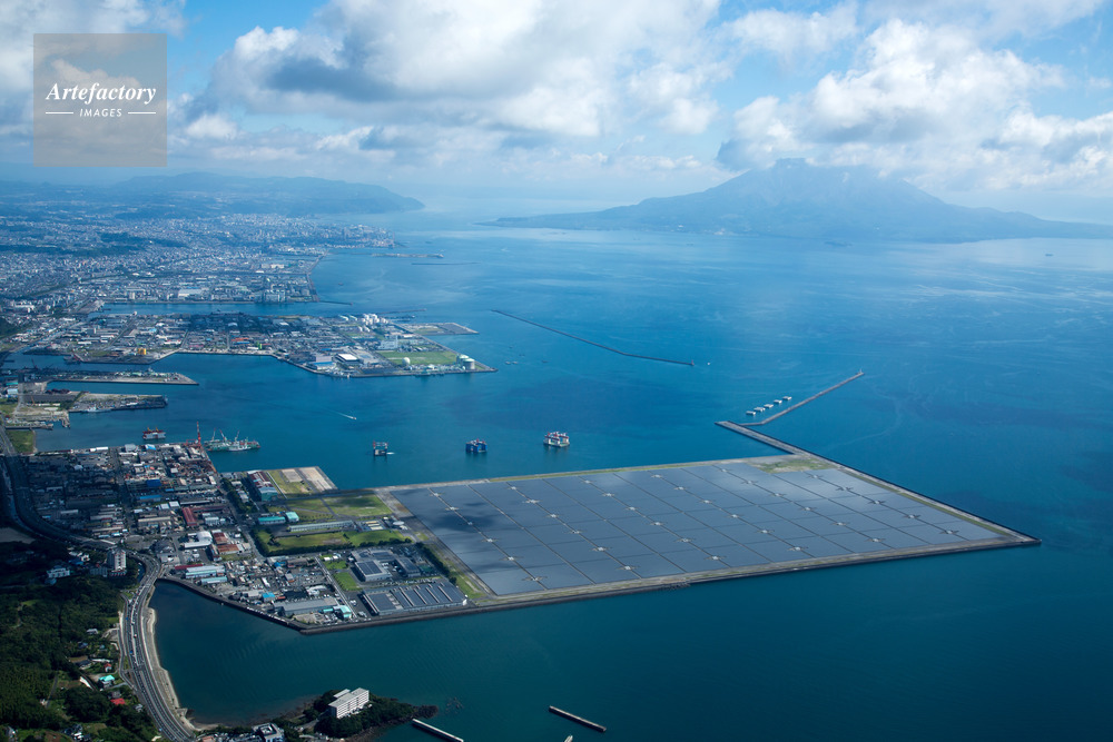 | 作品タイトル | 鹿児島七ツ島メガ ソーラー発電所より鹿児島市街地と鹿児島湾、桜島 | モデルリリース | なし | |
