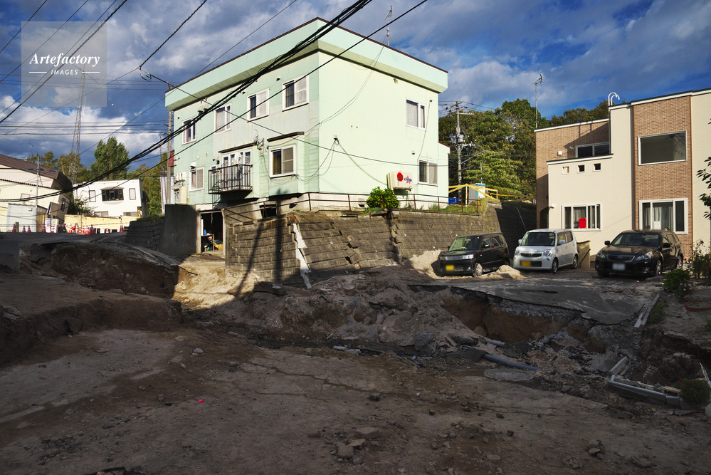 | 作品タイトル | 液状化現象により陥没した道路と家屋倒壊 | モデルリリース | なし | |