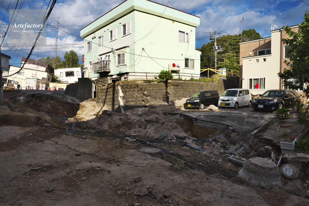 | 作品タイトル | 液状化現象により陥没した道路と家屋倒壊 | モデルリリース | なし | |