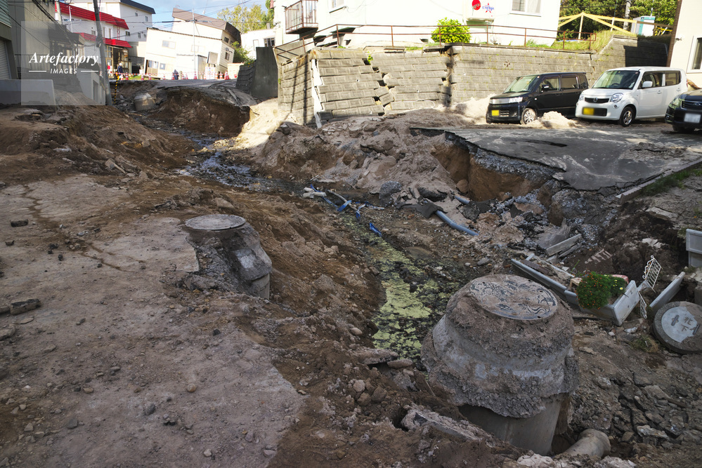 | 作品タイトル | 液状化現象により陥没した道路と家屋倒壊 | モデルリリース | なし | |