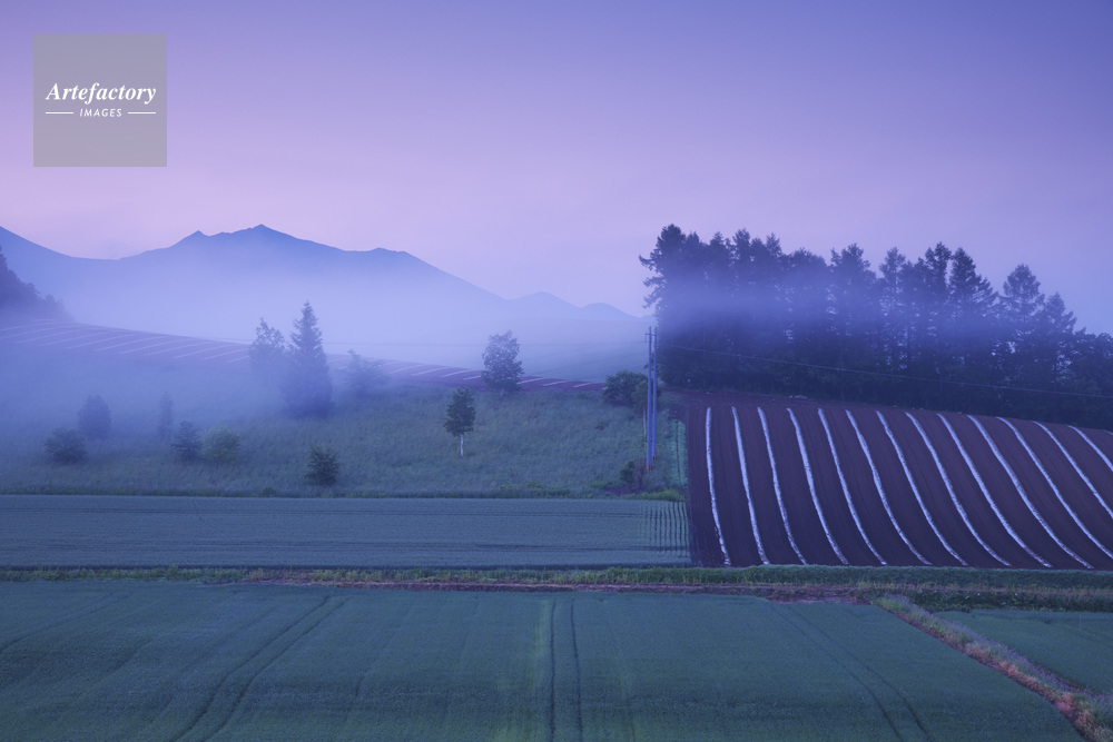 | 作品タイトル | 朝霧の農地と十勝岳連峰 | モデルリリース | なし | |