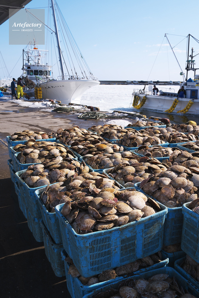 | 作品タイトル | 尾岱沼漁港のホタテの荷揚げとホタテ漁船 | モデルリリース | なし | |