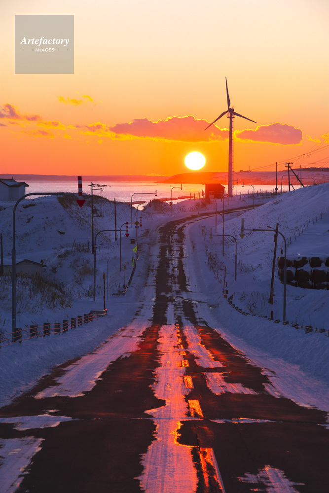 | 作品タイトル | 風力発電と道と日没 | モデルリリース | なし | |