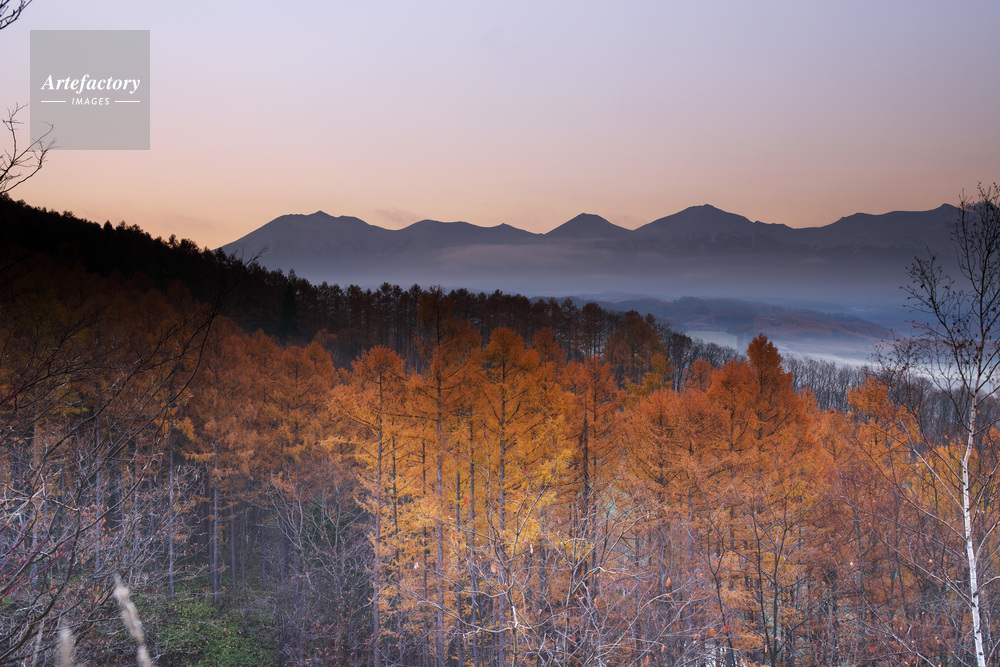 | 作品タイトル | 十勝岳連峰とカラマツ林の朝 | モデルリリース | なし | |