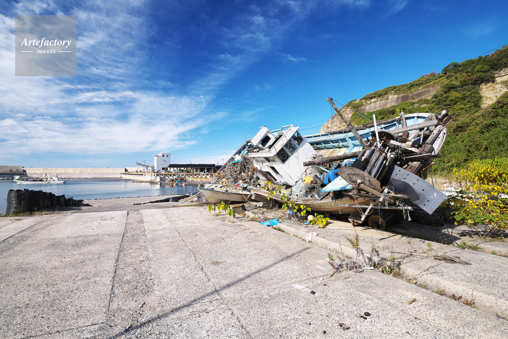 | 作品タイトル | 仮復旧した鹿磯漁港と能登半島地震で打ち上げられた漁船 | モデルリリース | なし | |