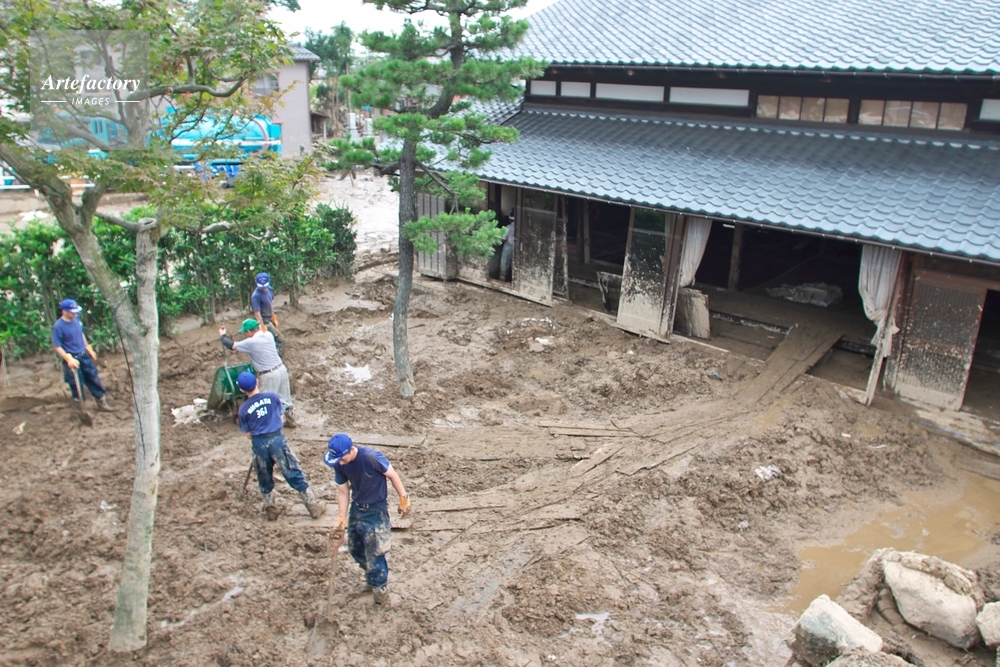 | 作品タイトル | 豪雨の被害、泥に埋まった住宅の復旧作業 | モデルリリース | なし | |