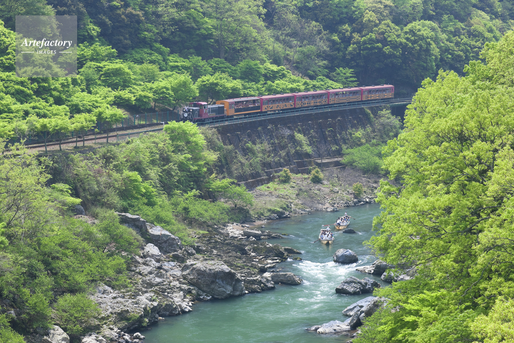 | 作品タイトル | 新緑の保津峡トロッコ列車と保津峡川下り | モデルリリース | なし | |