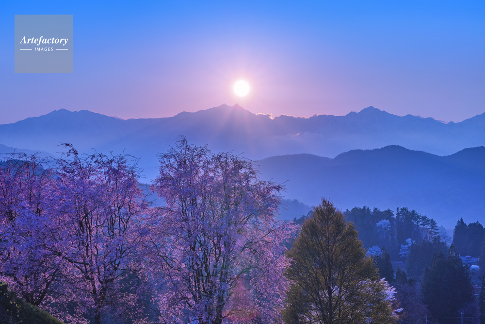 | 作品タイトル | 夕日に染まる小川村の桜と北アルプス | モデルリリース | なし | |
