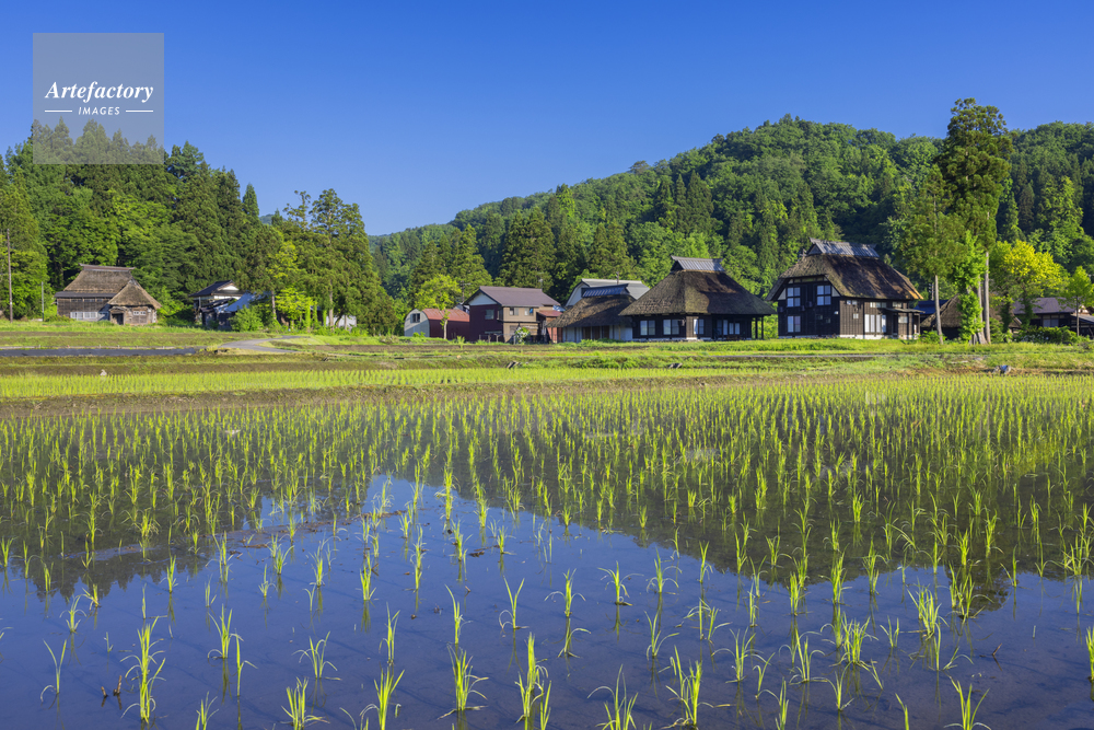 作品タイトル     新緑の荻ノ島かやぶきの里と水田 モデルリリース なし