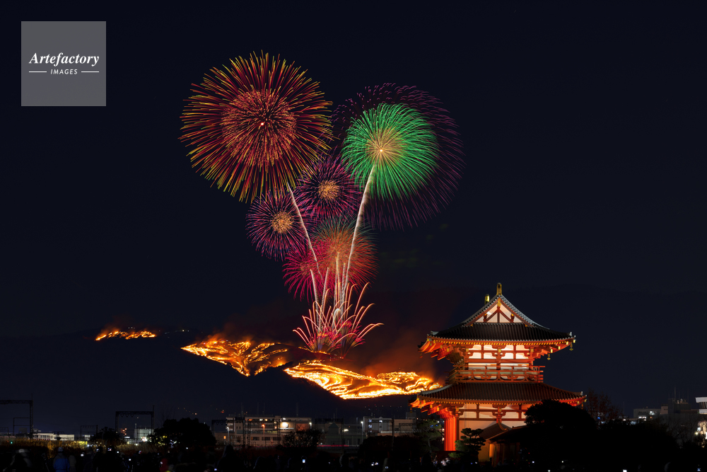 | 作品タイトル | 平城宮跡の朱雀門と若草山の山焼きと花火 | モデルリリース | なし | |