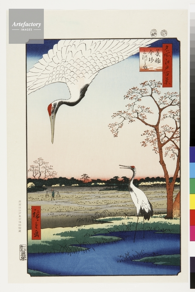 | キャプション | 浮世絵復刻版画 / 「蓑輪」は現在の三ノ輪を指す。荒川が氾濫するためこの付近は湿地帯であった。将軍家の放鷹の場として利用したが、鶴が舞降りるため幕府は一帯を餌付けの保護区に指定、見張りや番犬等を置く事となった。歴代の将軍が鶴見に訪れた場所だ。 | 制限事項 | ||