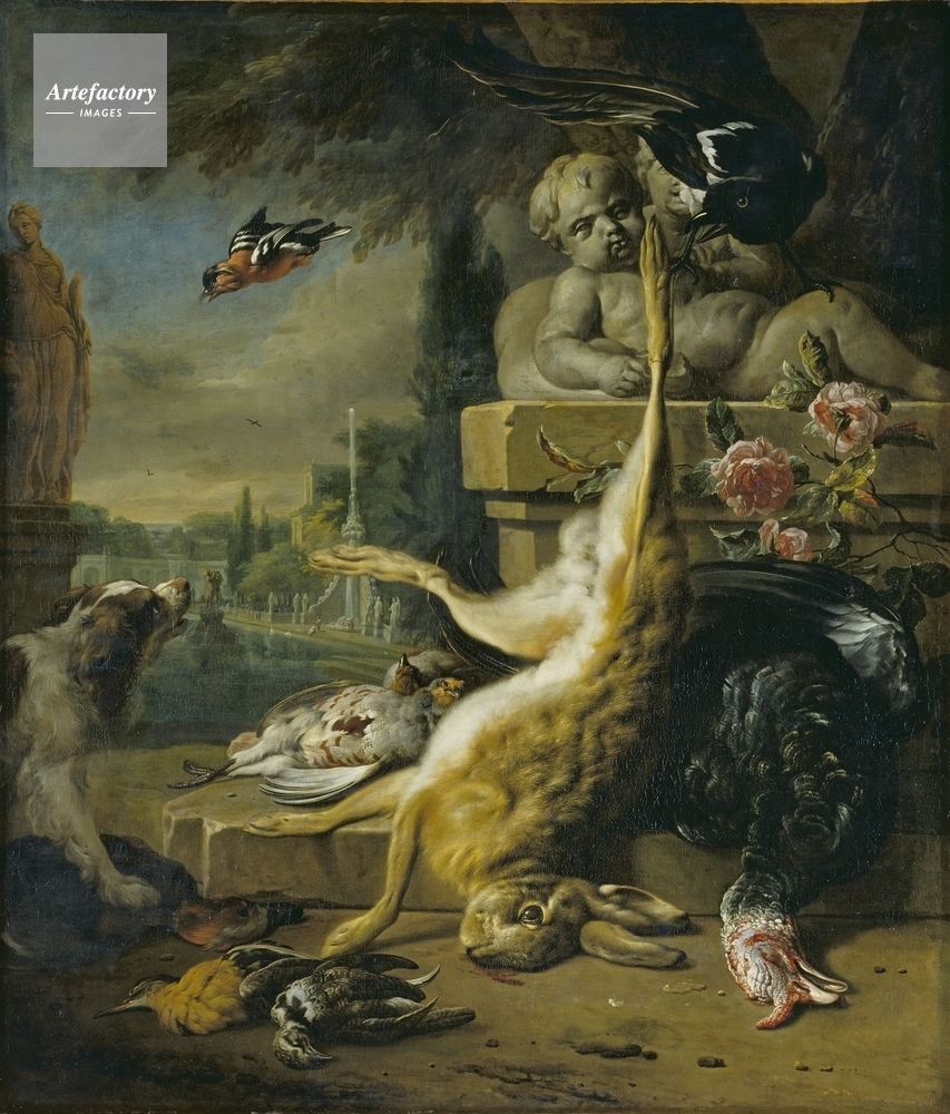 | キャプション | Various dead game including a hare, a turkey and a black grouse in a park scene. A brown and white dog stands to the left, and pink roses grow to the right behind the hare. | 制限事項 | ||