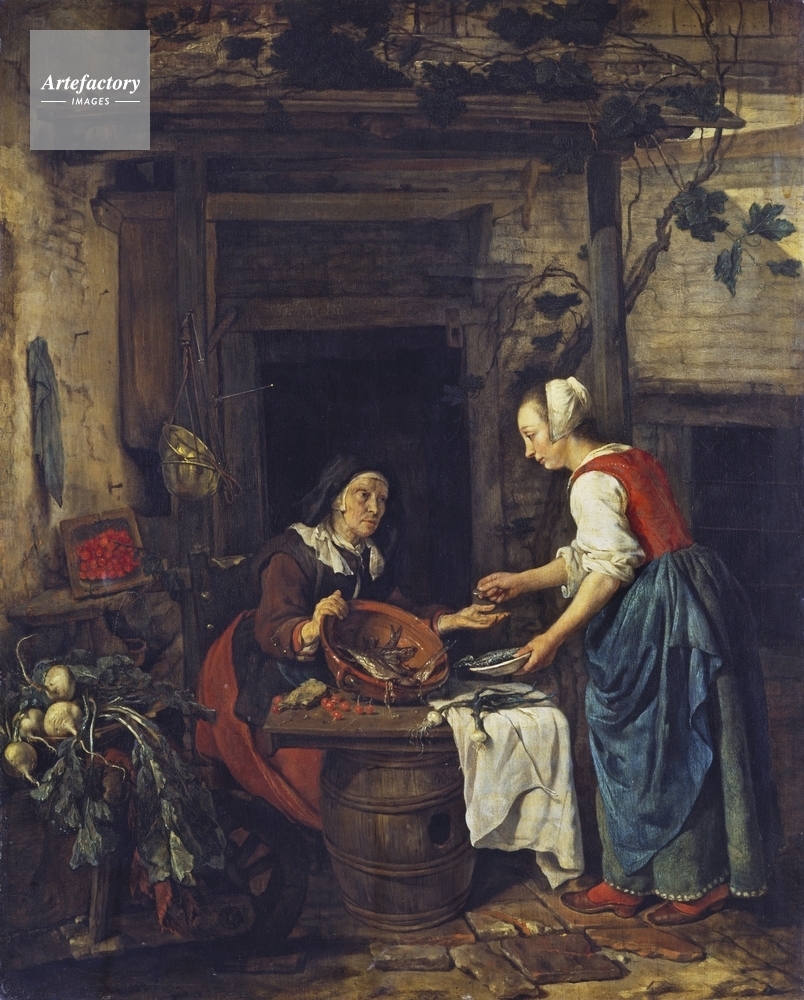 | キャプション | Two women in a doorway surrounded by various fresh produce. One woman in a rust-brown skirt sells fish to a younger woman in a blue-green skirt, blue apron and red skirt. | 制限事項 | ||