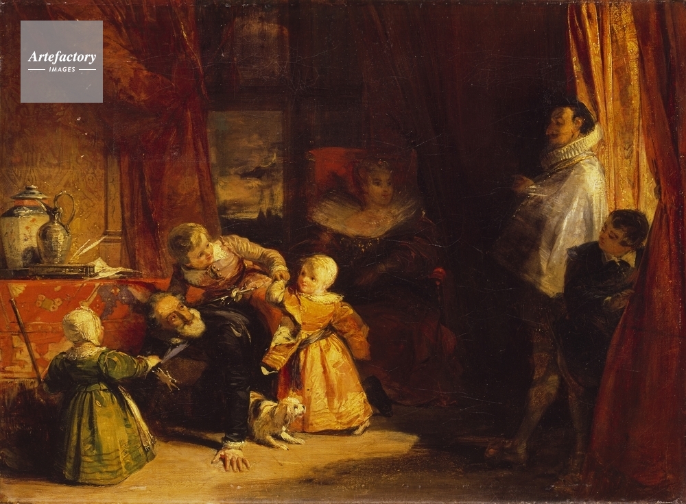 | キャプション | In a small room Henri IV of France (1553-1610), on the left, playing with his children. In the centre Queen Marie de Medicis. On the right the Spanish Ambassador enters the room, surprised to discover Henry in such an undignified position. See also P733. | 制限事項 | ||
