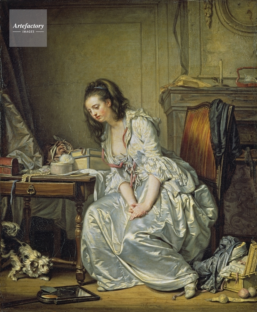 | キャプション | A woman looking down at a broken mirror. She wears a white satin dress and a blue ribbon is in her brown hair. A dog is on the left. A shawl hangs over her chair and pearls with other objects are scattered on the table to the left. | 制限事項 | ||
