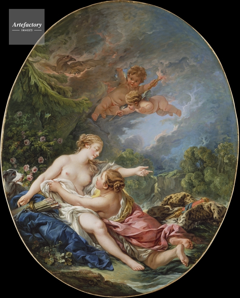 | キャプション | The seated Callisto is embraced by Jupiter transformed into Diana. His symbol, the eagle, and amours with a torch and arrow of love hover above. | 制限事項 | ||