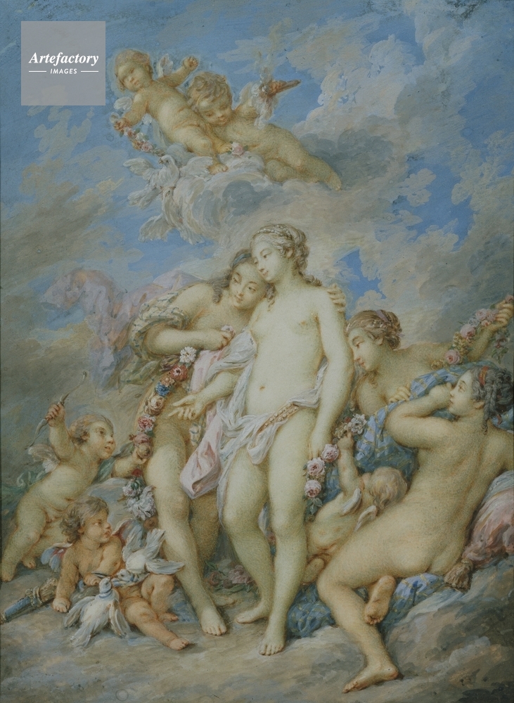 | キャプション | Venus in the centre has a pink girdle studded with pearls. One putto on the left holds a bow and the apple, another holds two doves on a leash. Two females on the right hold flowers. Probably after a lost composition by Boucher. | 制限事項 | ||