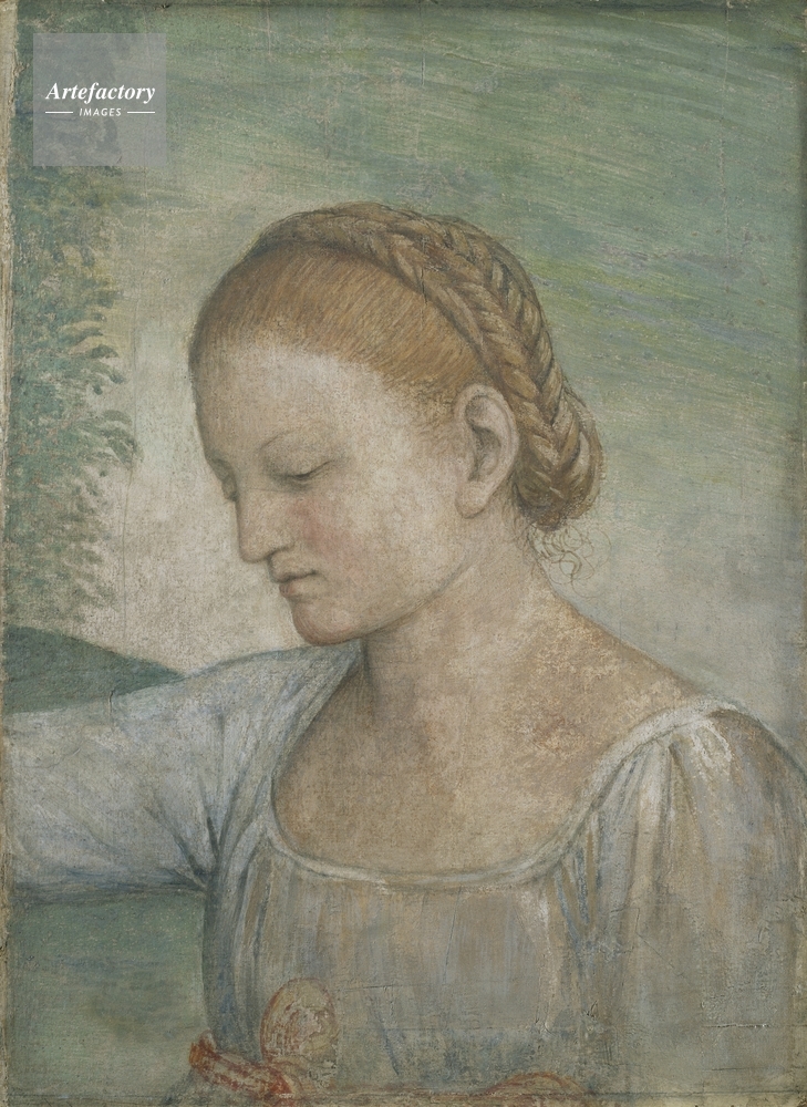 | キャプション | A head and shoulders figure of a girl, her right arm raised, with fair hair swept up away from her face, dressed in a white dress with a red girdle. From the Villa Pelucca, near Monza. See also P526. | 制限事項 | ||