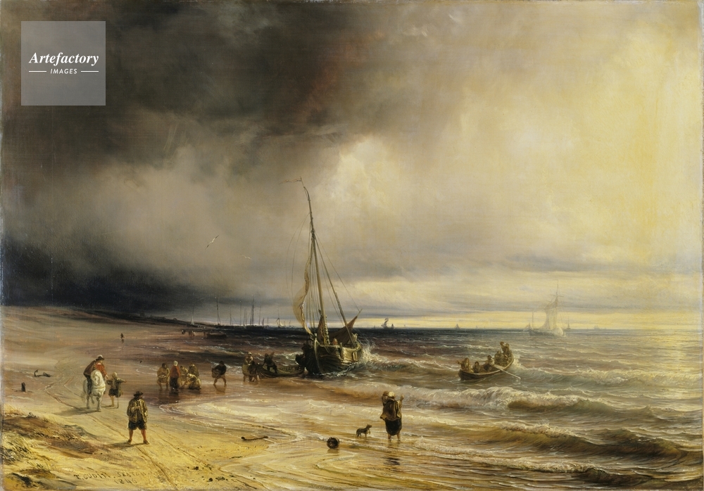 | キャプション | The Dutch coast with figures on the beach and several boats scattered along the shore. The sea is rough and dark clouds gather to the left-hand side of the sky. | 制限事項 | ||