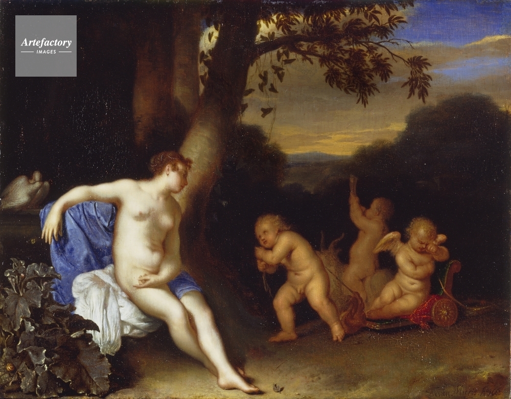 | キャプション | In an Italianate landscape a naked Venus, accompanied by two doves, sits at the base of a tree looking towards a weeping Cupid, who is pulled towards her on a chariot by an amour as another amour rides a goat and blows a horn. | 制限事項 | ||