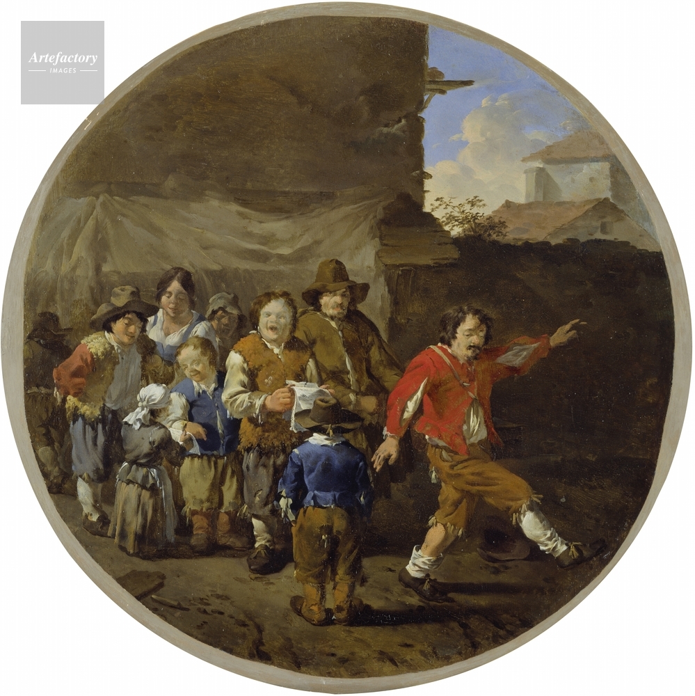 | キャプション | In front of a wall covered with a sheet a group of strolling players sing as another of their company dances in the street. | 制限事項 | ||