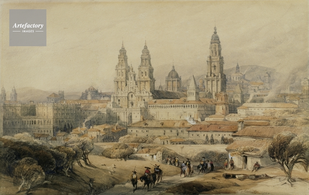 | キャプション | A view of Santiago Cathedral, with the cloisters on the right, surrounded by other buidlings. There are figures, horses and trees in the foreground. | 制限事項 | ||