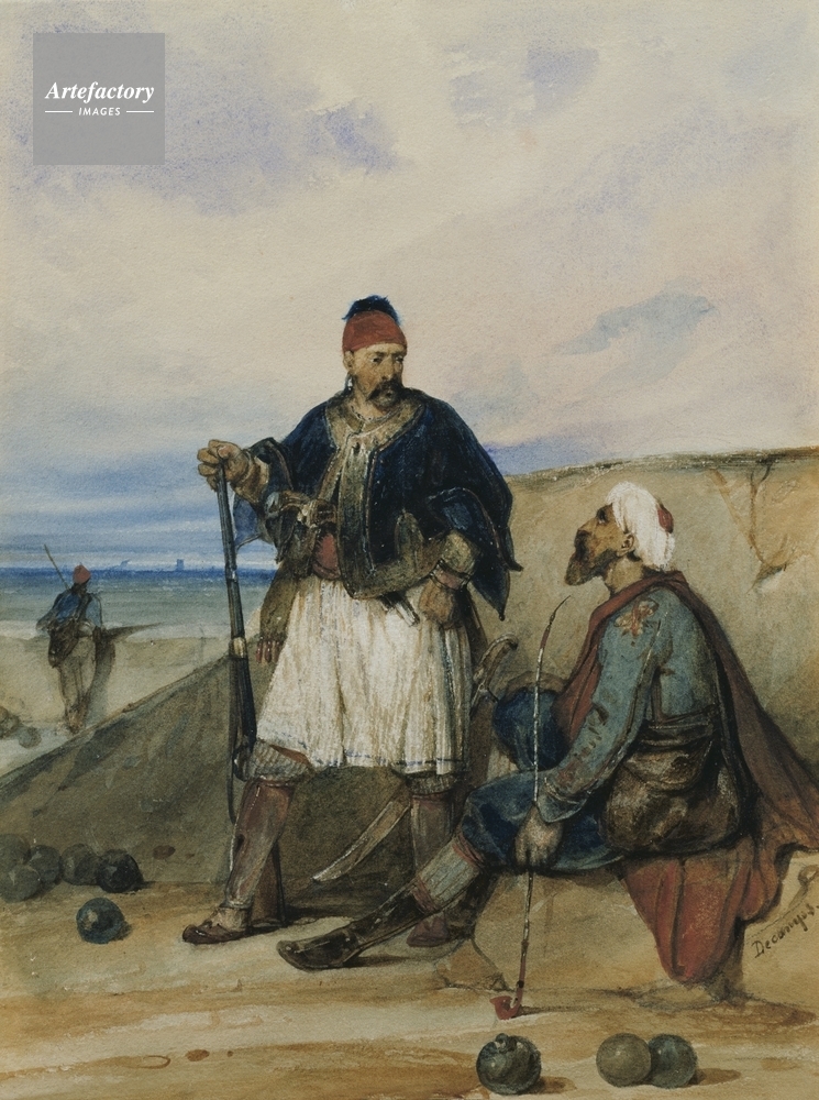 | キャプション | Two Eastern soldiers. The man standing wears a rich blue cape and holds a long-barrelled gun in his right hand. The other man on the right is sitting, dressed in a red cape and a white turban. | 制限事項 | ||
