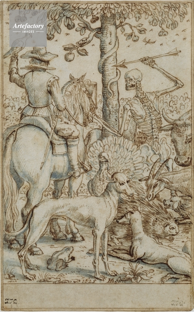 | キャプション | Beside the tree of knowledge, with its serpent and tempting apple, a skeleton, symbolising death, points an arrow at a huntsmen who rides a horse and holds a falcon. They are surrounded by animals and birds including a turkey, porcupine and hunting dogs. | 制限事項 | ||