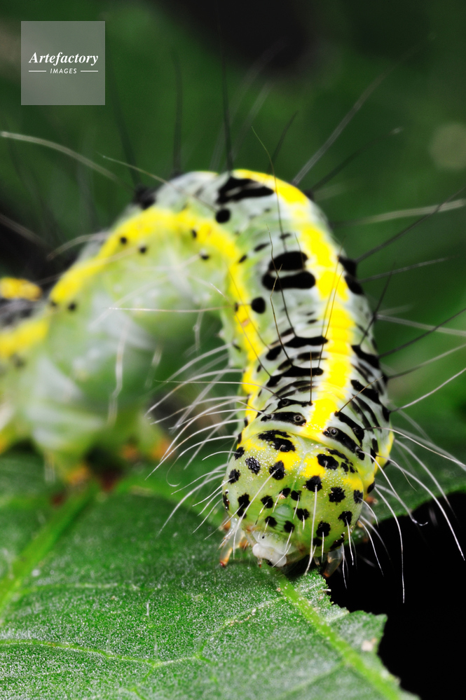 | 作品タイトル | オクラの葉を食べるフタトガリコヤガ・幼虫 | モデルリリース | なし | |