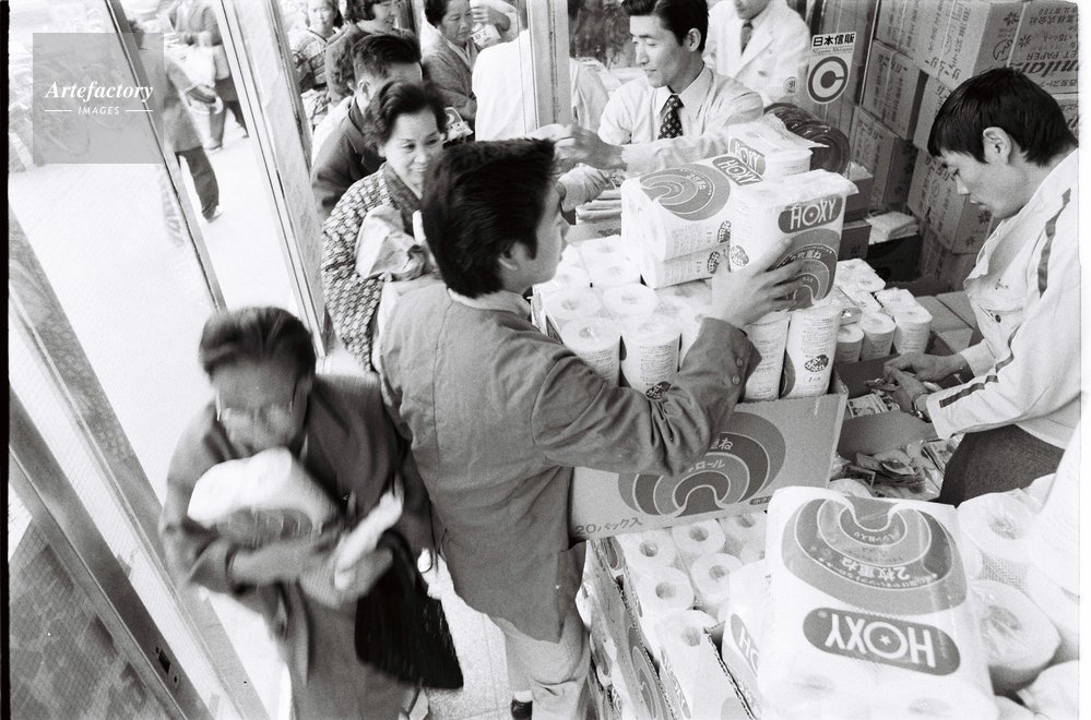 | キャプション | 砂糖、洗剤、トイレットペーパーを店頭売り。山のように積み上げられたトイレットペーパーを行列をして買い求める人たち | 制限事項 | ||
