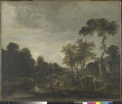 An Evening Landscape with a Horse and Cart by a Stream